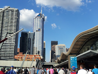 While back in Melbourne for the weekend we were also able to catch a Fremantle, Dockers game. I'm still in limbo about who I go for yet. But at the moment, it's easy enough to support the team my boyfriend goes for. So, with that said we were off to a rare game in Melbourne. We also had a rare, but beautiful amount of sun in Melbourne. It was an afternoon game. The sun was out and very warm in Williamstown. But Williamstown weather generally varies vastly to the city. So, alas again I had no idea what to wear. I hate being cold. But I also HATE sweating in public. We've only been to night games so far, so I haven't had to worry about being too warm. For whatever magical reason Melbourne was warm and perfect while we were home. We took the train there. Paul was the only Dockers supporter on the train. It was a Bull Dogs (a Footscray/local team) vs. Dockers (Fremantle/away/way less supported team) game.The game was at Etihad stadium. I had never been there yet. I actually really liked that stadium. It seemed like most seats there would have a good view of the field.
